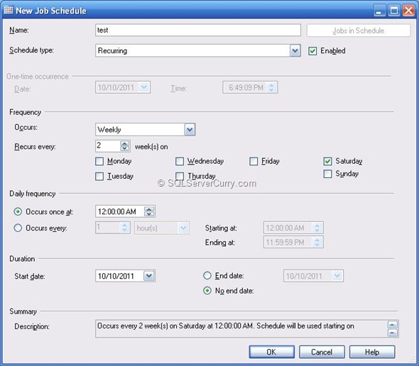 A new window will popup. Under frequency section, select weekly for "Occurs" option. Select 2 on "Recurs every" option. Under days option choose "Saturday". Click ok.